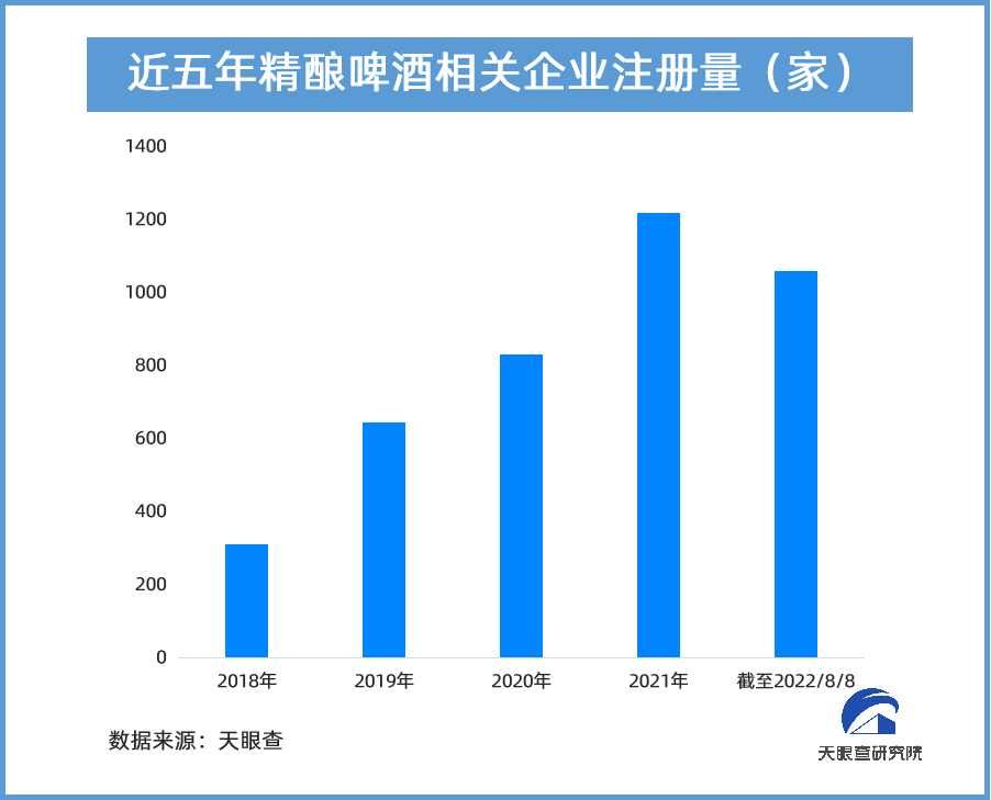 在需求的拉动下,精酿啤酒相关企业数量一路猛增。天眼查数据显示,截至目前,我国拥有约4,400家精酿啤酒相关企业。从成立时间来看,95.5%的相关企业成立时间在5年之内,成立于1~5年的占比超6成,成立于1年内的占比超3成,我国精酿啤酒赛道发展高歌猛进。近五年,精酿啤酒相关企业新增注册数量均保持高速增长,年平均增速达95%。截止目前,2022年共新注册1,000余家精酿啤酒相关企业,相比较于去年同期增长34.5%。