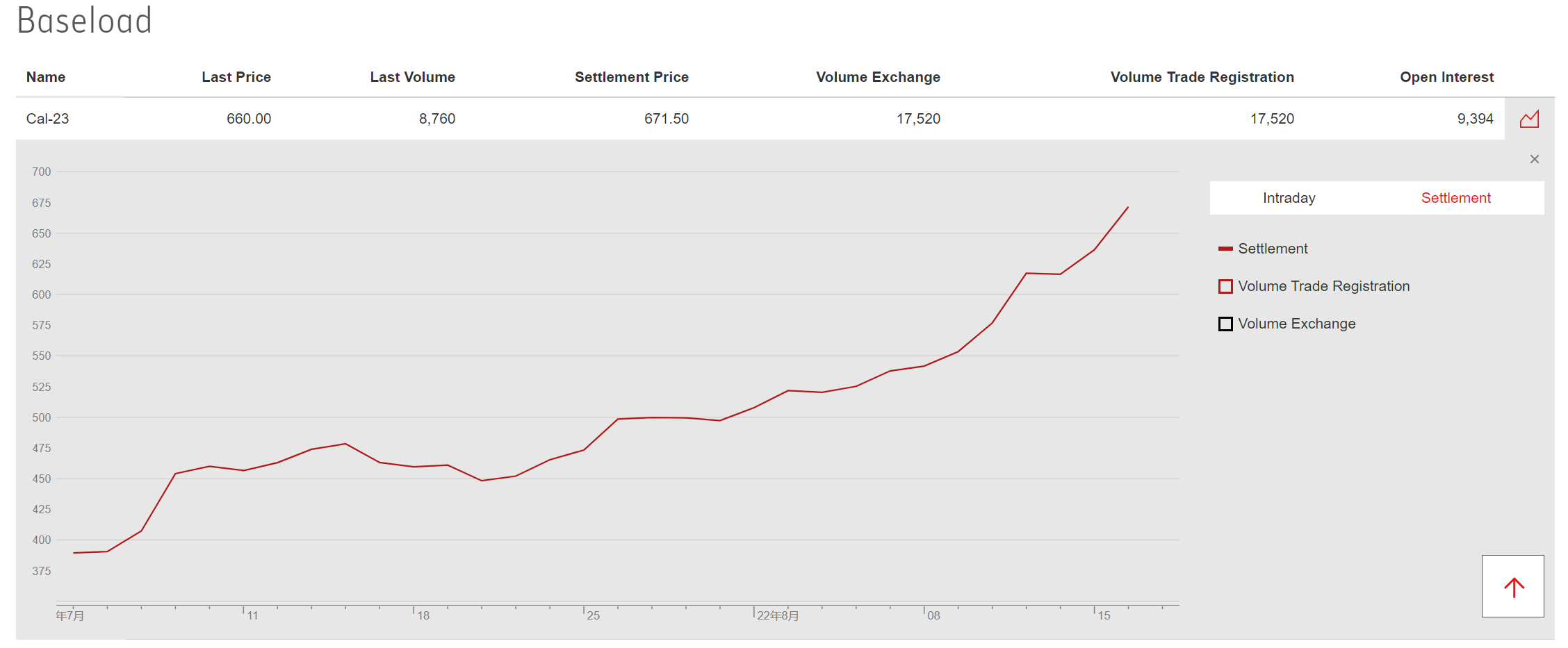 截至当地时间8月16日收盘,法国2023年交付的基本负载电力期货结算价涨5.5%,至纪录新高671.5欧元/兆瓦时。8月以来,该结算价已累计上涨32.3%。