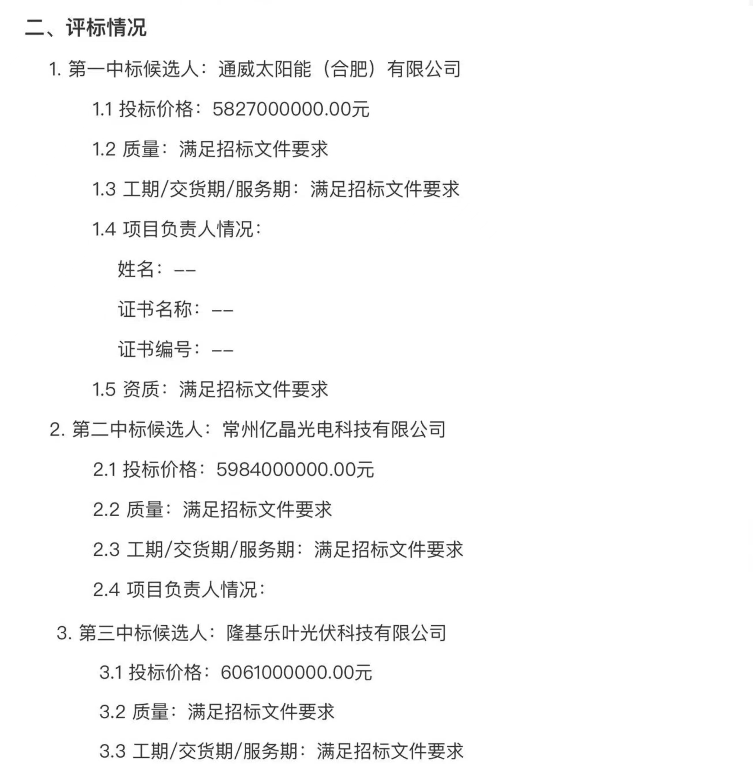 据华润电力公告,通威太阳能(合肥)的投标价格为58.27亿元,折合单价为1.942元/瓦;亿晶光电投标价格为59.84亿元,单价为1.995元/瓦;隆基乐叶投标总额为60.61亿元,单价2.02元/瓦。