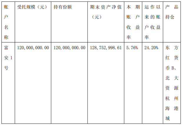 据中信证券提供的富安1号产品2021年年报及询证函显示,2021年度产品受托规模为1.20亿元,期末资产净值为1.29亿元,该期账户收益率为5.76%,主要持仓东方红货币B、北大资源杭州海港城(目前已更名为“博雅城”,下文统一称博雅城)两个产品。