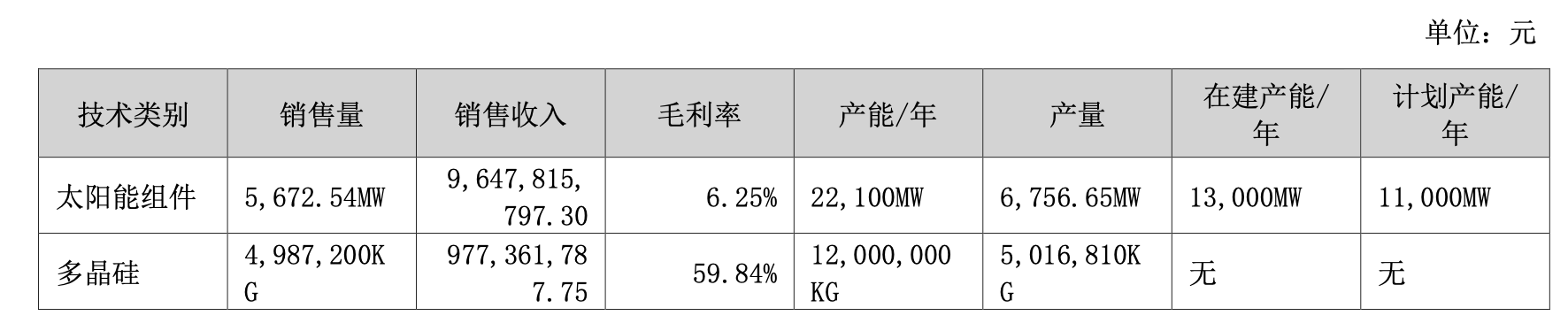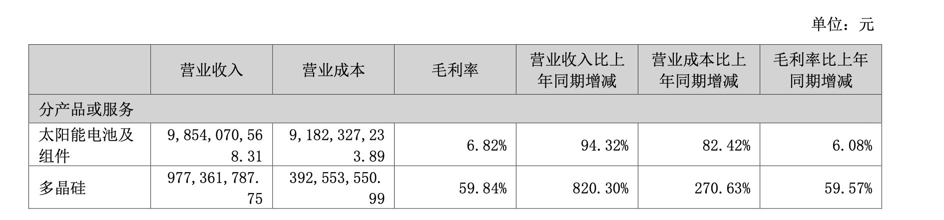 上半年,太阳能电池及组件业务为东方日升带来营收98.54亿元,同比增长94.32%,占总营收比重达78.11%;多晶硅收入为9.77亿元,同比大幅增长820.3%,占总营收比重的7.75%。