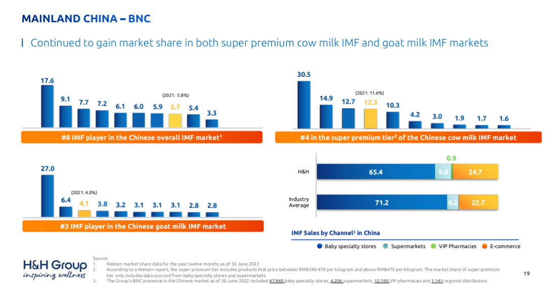 总体来看,这家本土婴幼儿奶粉制造商的市场地位稳定。尼尔森数据显示,截至2022年6月30日止12个月,健合集团在中国婴幼儿配方奶粉占据市场份额5.7%(2021: 5.8%),排名第八。