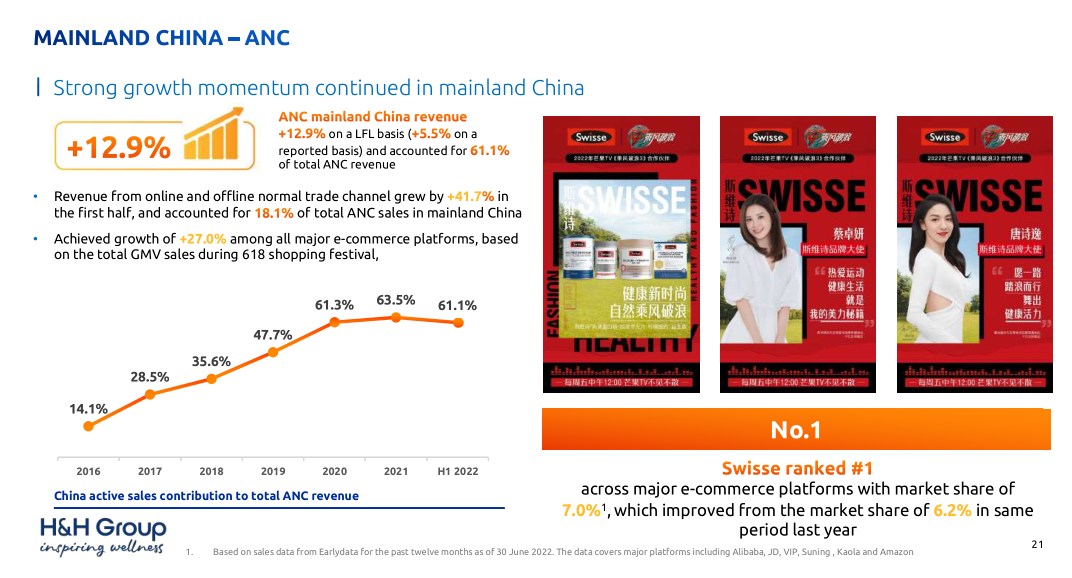 “Swisse在中国内地市场的表现非常棒,主要的驱动力来自于线上和线下的一般贸易渠道。”安玉婷表示。小食代翻阅的会议演示资料显示,上半年,线上和线下的一般贸易渠道收入同比大涨41%,在中国内地市场的ANC业务营收中占比达18.1%。