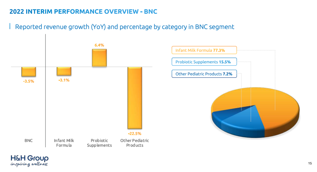 健合今天指出,2022年上半年,婴幼儿营养与护理用品业务(BNC)营收达31.8亿元,同比下降3.5%,仍贡献集团最大营收占比(53.4%)。