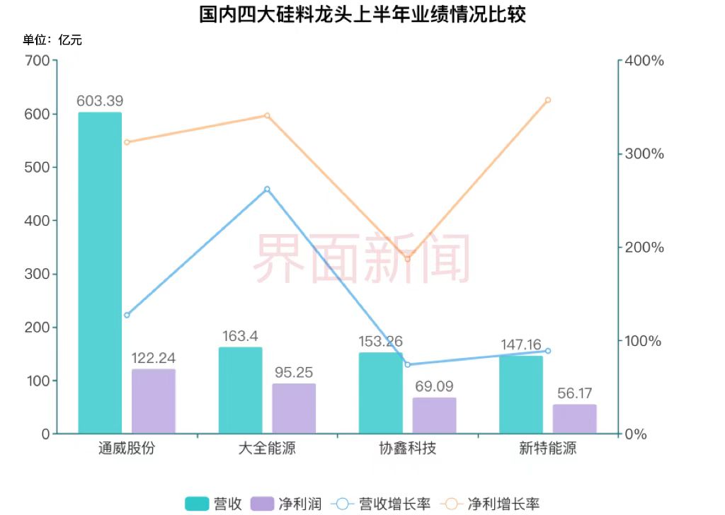 大全能源的业绩全部来自于硅料,上半年净利为163.4亿元,同比上涨3.4倍,增幅排名四家企业第二。