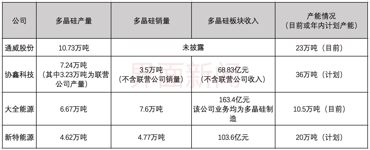大全能源、新特能源分列三四名,上半年产量分别为6.67万吨和4.62万吨。