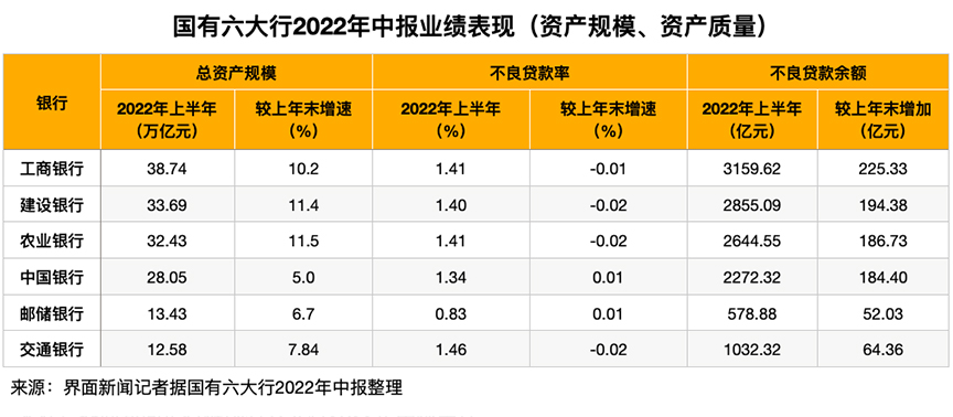 界面新闻记者关注到,银保监会公布的数据显示,截至2022年二季度末,商业银行不良贷款率1.67%,其中,大型商业银行不良贷款率为1.34%。国有六大行的不良贷款率均低于商业银行平均水平,但仅邮储银行优于同类型银行的平均水平,为0.83%,中国银行保持同业平均水平。