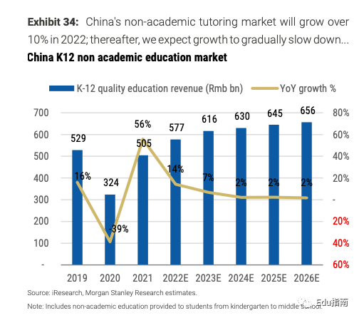 摩根士丹利认为,国内用户对该类课程需求稳定,预计2022年和2023年,非学科辅导的市场规模将保持增长,2022年市场规模预计达 5770亿元,2023年预期将增长到6160亿元。