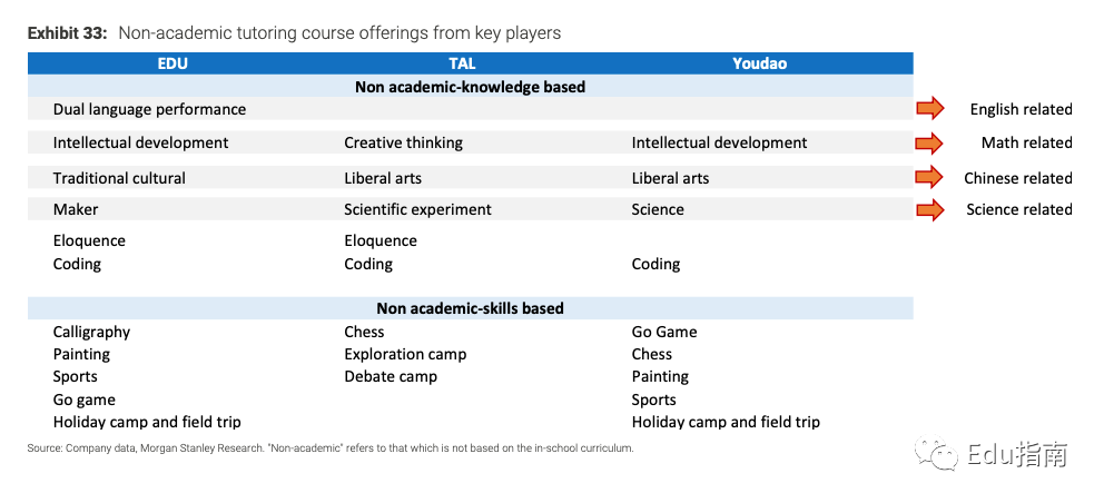 研报称,在非学科辅导市场,新东方、好未来从零开始增长,有道迅速扩张,当前整个行业仍然是一个非常多元化的市场:新东方好未来从2021冬季学期开始发展他们的素质教育新业务。该项非学科辅导新业务,或成为两家公司2023财年最大的收入贡献来源。有道公司此前已经布局素质教育业务,在人文课程方面拥有优势。