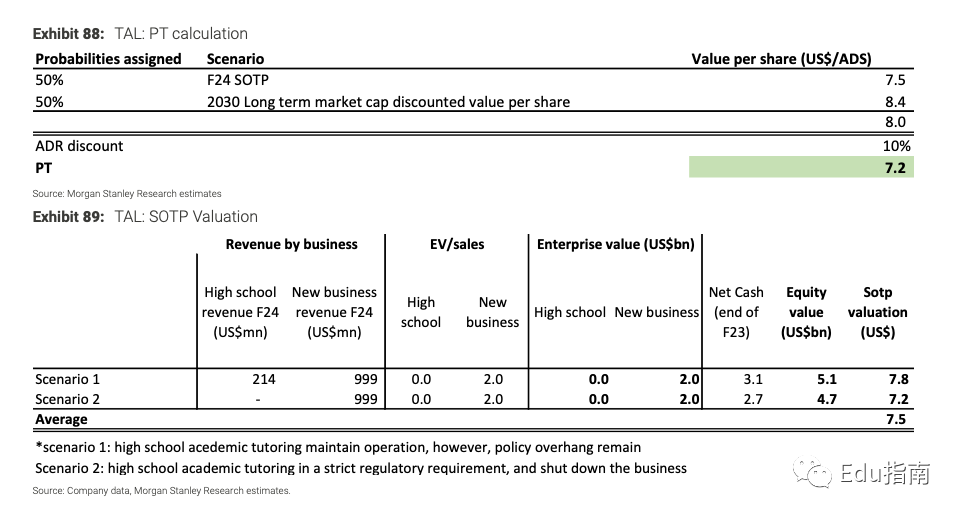 研报中,摩根士丹利降低了对好未来2023财年和2024财年的收入预测,因为好未来的原有业务规模,包括高中学业辅导等收入将远小于的预期。此外,还降低了对好未来公司2023财年的净损失估计。考虑到新业务的贡献与长期潜力,研报对好未来的目标价评估为7.2美元。