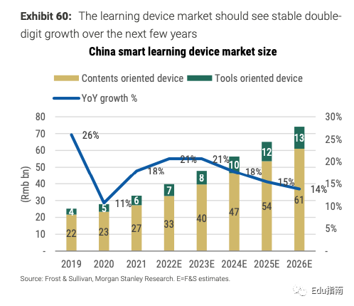 以内容为导向的智能学习设备,正在帮助用户更高效的自学。摩根士丹利预测,智能学习硬件和内容市场的增长将加速,未来5年,将以18%和22%的年复合增长率增长,至2026年市场规模分别达到740亿元、660亿元。