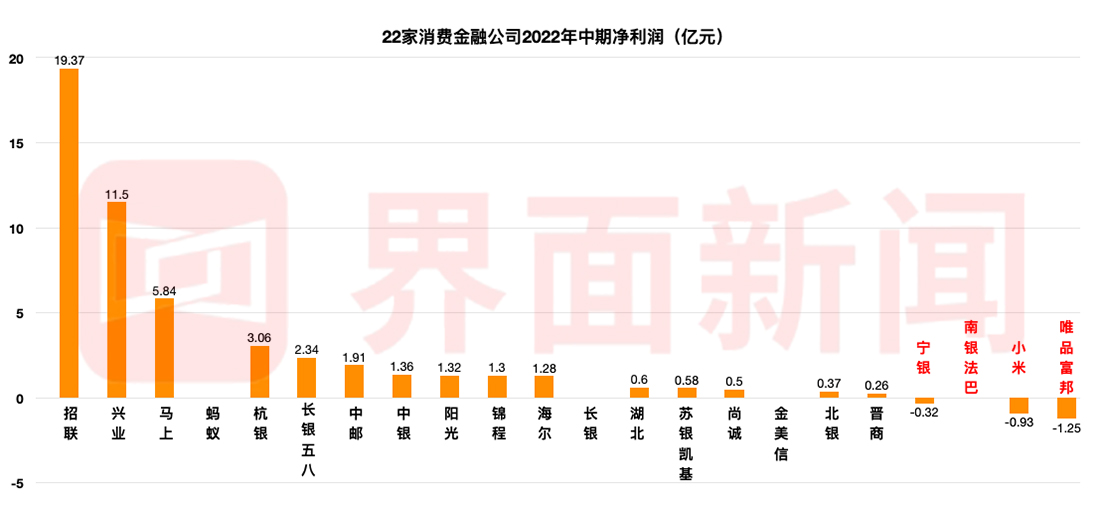 在净利润可查的22家消费金融公司中,仅宁银消费金融(原华融消费金融)、南银法巴消费金融(原苏宁消费金融)、小米消费金融和唯品富邦消费金融2022年上半年呈现亏损,净亏损分别为0.32亿元、0.92亿元、0.93亿元和1.25亿元。