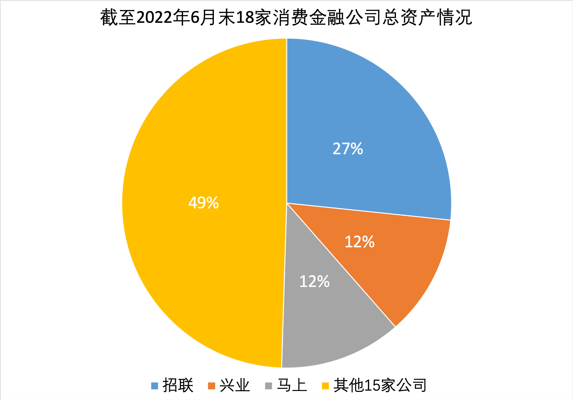 资产规模方面,截至2022年6月末,数据可查的18家消费金融公司总资产规模合计5365.18亿元。“前三强”的总资产之和占比超一半,其中“冠军”招联消费金融总资产为1429.71亿元,是唯一一家总资产超过千亿的消费金融公司,马上消费金融和兴业消费金融和以641.65亿元、637.72亿元位列总资产排行的第二和第三。