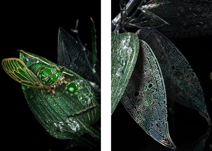 《悟蝉知翠》诉述逾五千年的中华文化故事。古代中国以农立国,蝉自古为人歌颂,被视为丰收、高洁、重生的象征。由于气温愈高,蝉鸣声愈大,古人以蝉为“神之使者”和最准确的“气候监测仪”。《悟蝉知翠》中,蝉抱一颗帝王翡翠,背面镶一颗温润的紫罗兰翠玉。极薄的翅膀运用了陈世英2002年发明的“翡翠切割润光专利技术”。