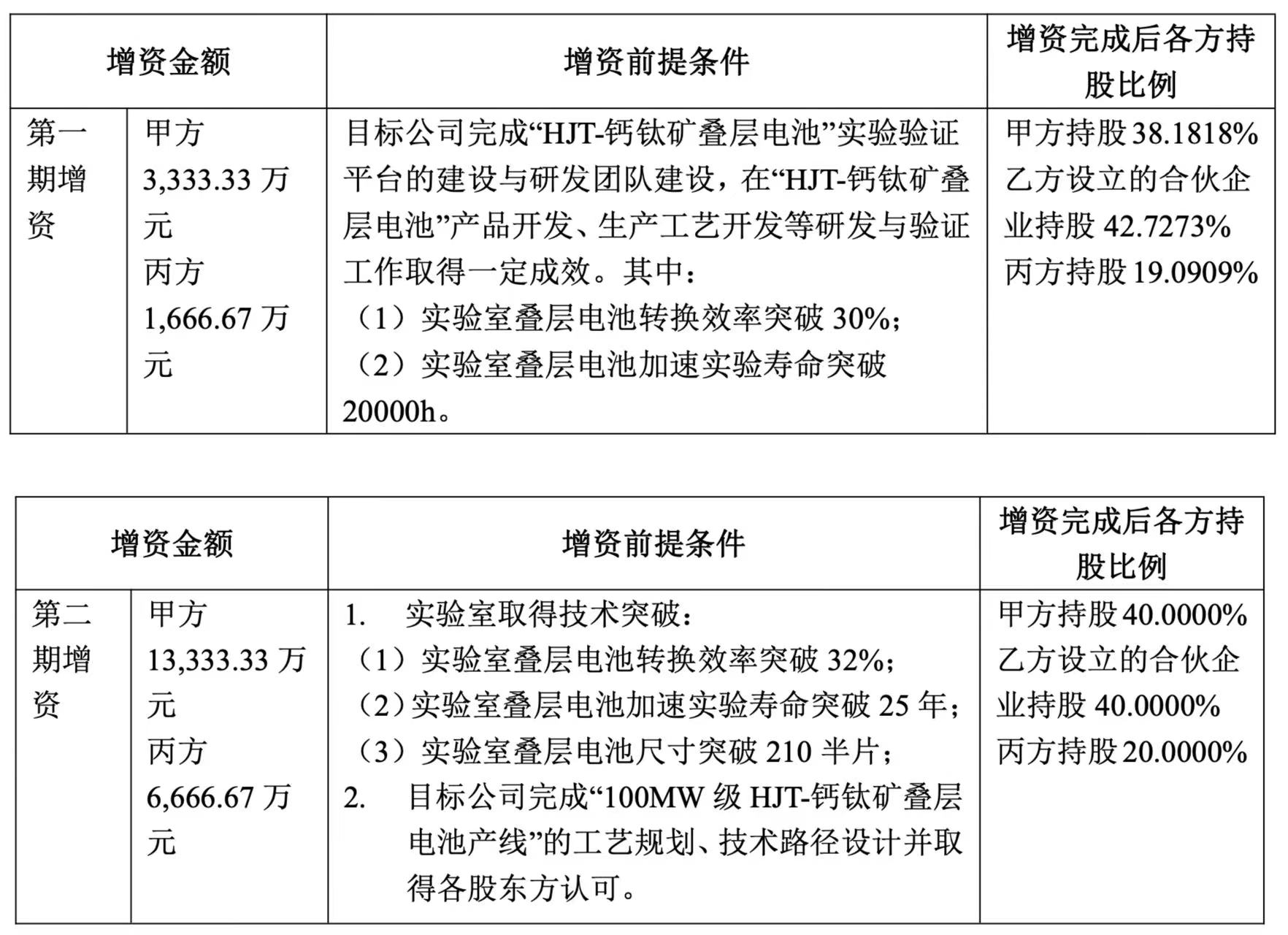 第一期增资时,合资公司需完成“HJT-钙钛矿叠层电池”实验验证平台的建设与研发团队建设,并在“HJT-钙钛矿叠层电池”产品开发、生产工艺开发等研发与验证工作取得一定成效。其中,实验室叠层电池转换效率突破30%,实验室叠层电池加速实验寿命突破2万小时。
