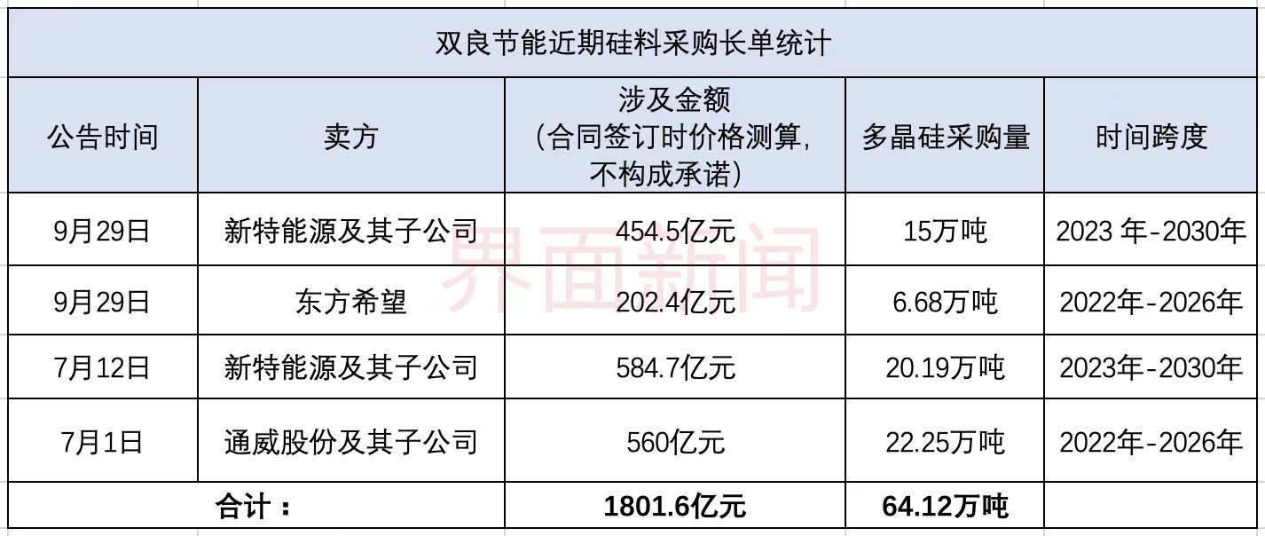 7月1日,双良节能还与通威股份(600438.SH)签约,涉及多晶硅20.25万吨,金额560亿元。