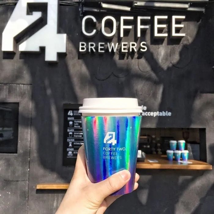 42 Coffee Brewers的镭射咖啡杯通过镭射和霓虹的搭配,是较早开始使用酸性设计元素的咖啡店之一,而这家店的名字42,则是出自《银河系漫游指南》里的一句典故:““42”——生命、宇宙以及一切问题的答案。”科幻范儿的包装和品牌内核合二为一,更是为咖啡里跳跃的酸度和视觉的酸彻底融合到一起,给人迷幻之感。