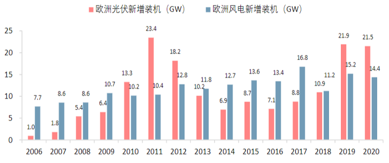 在欧洲,自2019年《欧盟绿色协议》达成以来,欧盟各国纷纷表态在2050年前实现“碳中和”,随着“欧洲绿色协议投资计划”、“可持续欧洲投资计划”及“公正过渡机制”等财政支撑持续发力,2019年欧洲年新增光伏装机环比增长超100%,接近22 GW,年新增风电15.2 GW。