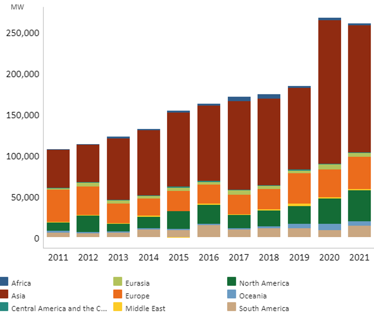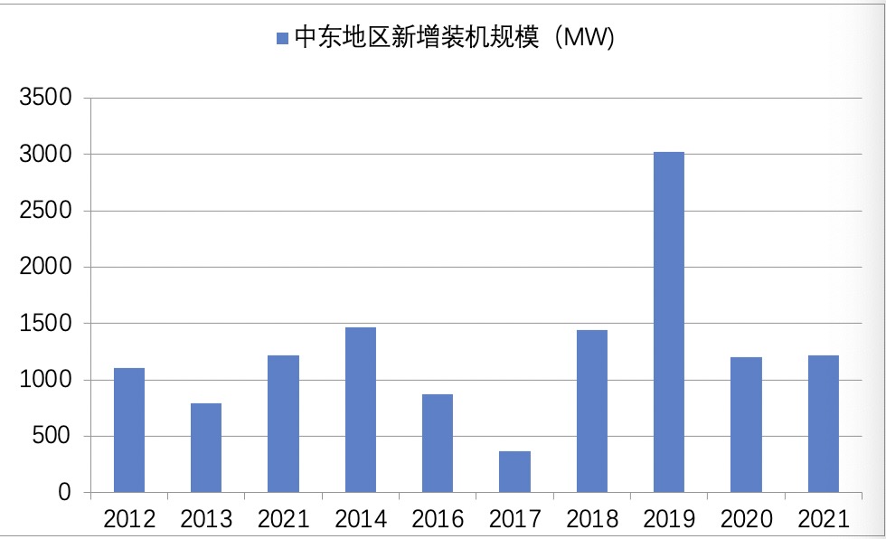 中东地区,土地资源廉价、光照资源丰富且项目授信极高,一直是全球光伏最低电价记录的诞生地。多年来,该地区年均新增装机规模一直在1 GW左右,2019年更是接近3 GW,截至2021年底,累计装机近24 GW。根据各国公布的《2030愿景》统计,新能源还将继续保持高速增长。