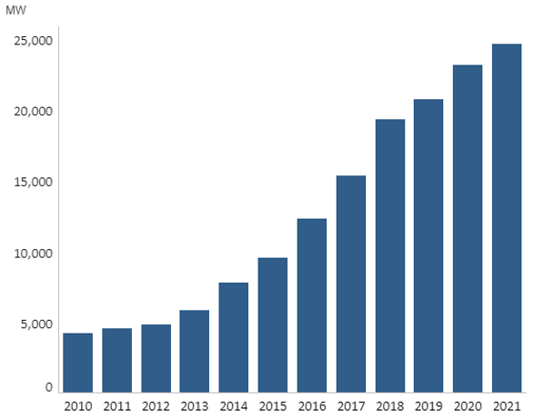 东南亚之越南,自2018年开始,光伏装机高速增长。2018年初,越南光伏装机容量仅134 MW,按照越南政府的规划,到2025年光伏装机容量将达到4 GW,但截至2020年底,越南累计光伏装机超过16 GW。截至2021年底,越南风光累计装机20.7 GW,占全国电力装机的27%,占总发电量的12%,领先中国超2个百分点。