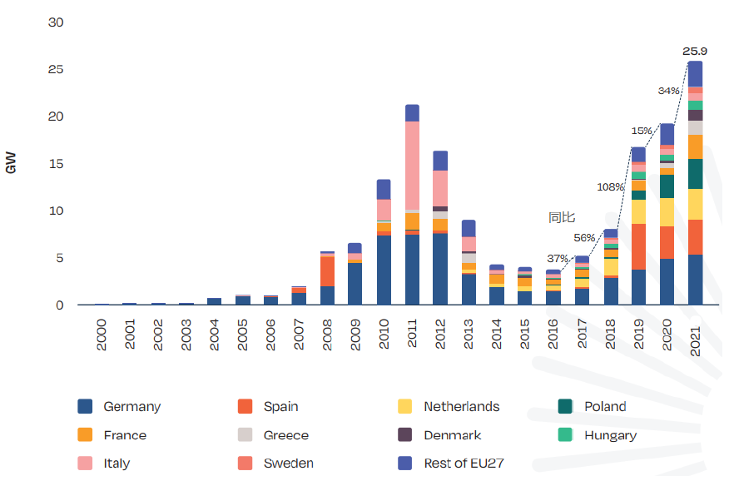2021年,欧洲风电和光伏创下新纪录,发电量达547 TWh,首次超过天然气发电量524 TWh。光伏在欧洲北部和南部发展迅猛, 2021年光伏发电量比2019年增加27%,同期荷兰和西班牙光伏发电量翻番。德国风光装机量占比55.81%,风光发电量占比达28.85%。