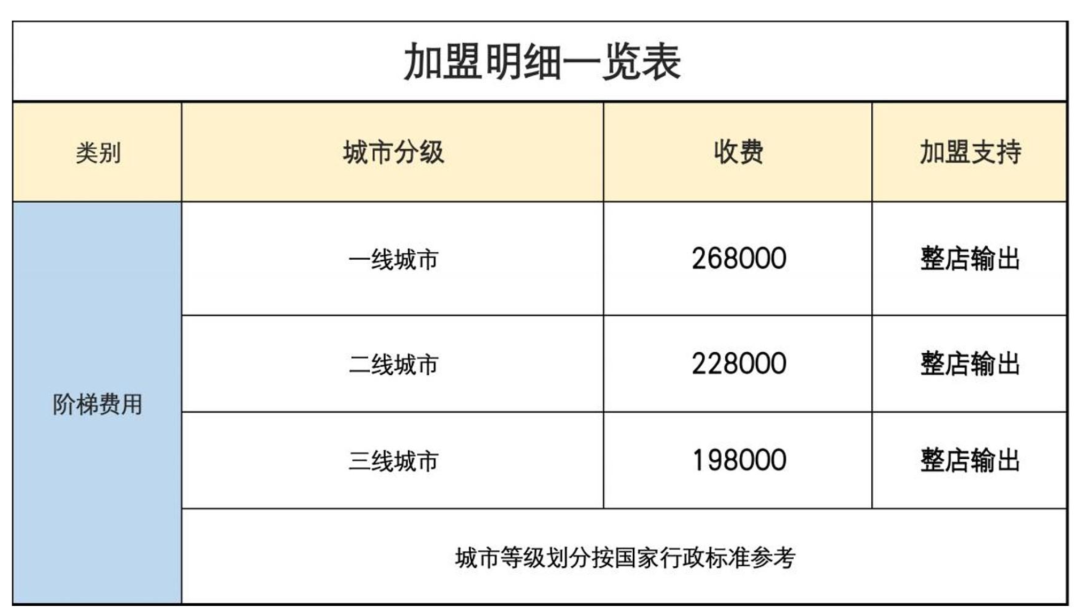 「深响」以加盟商的名义咨询价格,对方发来了一个表格,一线城市加盟费在26.8万元,二线城市22.8万元,三线城市19.8万元,提供的加盟支持为整店输出,即从选址到开业的筹备过程。在表格的下一页,还写出了利润公式:5教室*5次课*10-15人*2天(周末)*50周*200(单价)=2500000(年度毛利)。