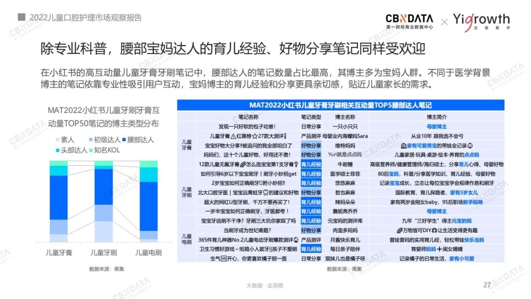 报告显示,具备医学背景知识的KOL发布的儿童口腔类产品笔记的互动量最高,此外,宝妈博主们一边分享好物,一面传递育儿经验的内容也同样广受欢迎——小红书平台上关于儿童牙膏牙刷互动量头部的内容中,主题是好物分享和育儿经验的笔记占据大多数。