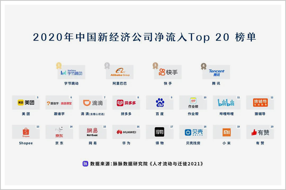 脉脉发布的《人才流动与迁徙2021》报告显示,字节跳动成为2020年人才流入最多的新经济公司,领先于阿里巴巴、腾讯等互联网巨头,几乎包揽了各家大厂人才去向的第一顺位。