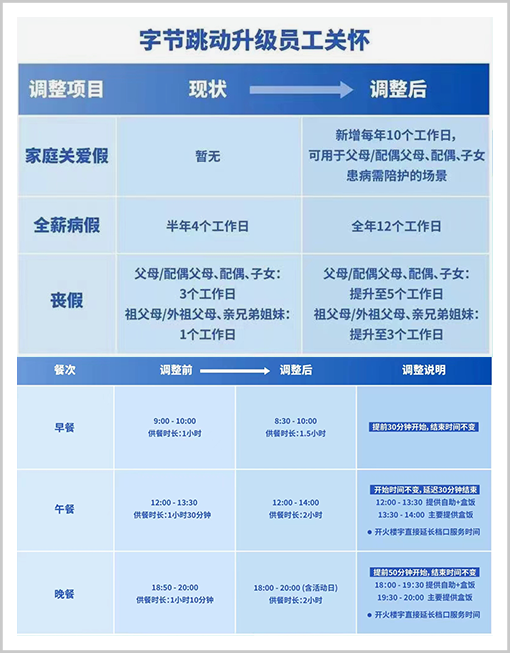 针对员工一直抱怨额餐厅开餐时间问题,字节也专门做了调整:早餐提前半小时开始,午餐延迟半小时结束,晚餐提前50分钟开始。而晚上如果加班打车,也比之前提早了半小时,21点30分就可由公司报销。