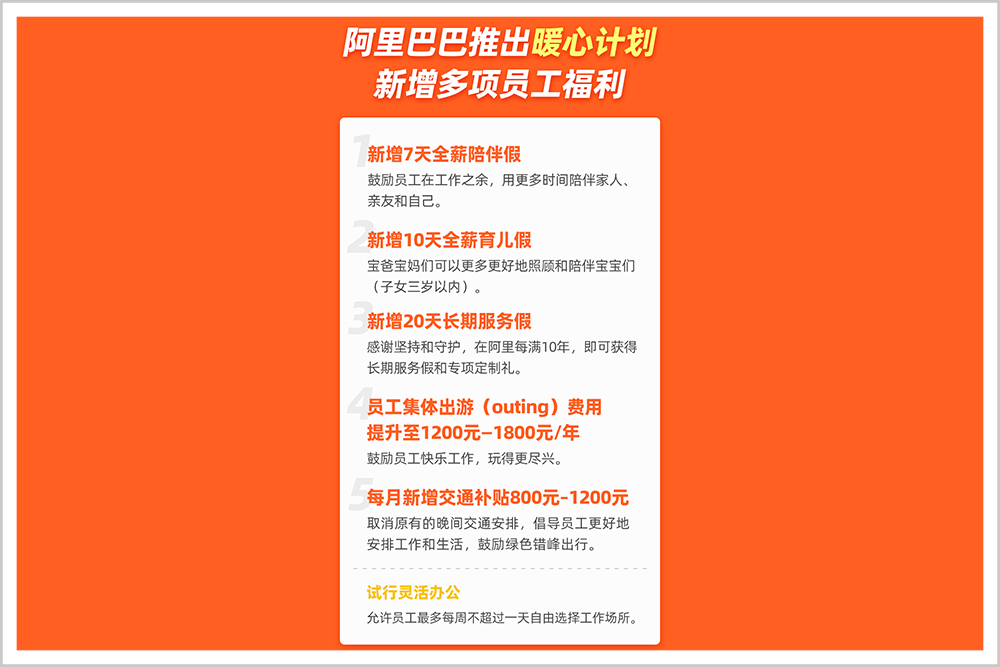 在两个月后,阿里则公布了多项针对员工关怀的“暖心计划”,率先响应国家号召延长产假、新增育儿假外,推出了7天全薪陪伴假、20天全薪长期服务假,同时新增交通补贴倡导绿色错峰出行,提高员工集体出游费用标准。