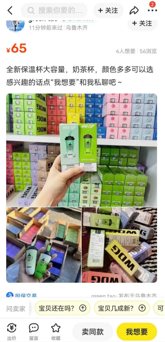 最近,一位电子烟店主还发现,在闲鱼上,也有店主在批量售卖这样的一次性电子烟。不过,「创业最前线」搜索相关关键词,发现该内容已经下架。
