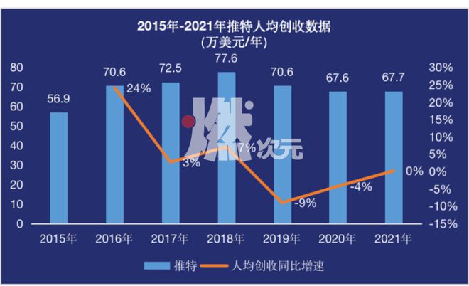 Wind数据显示,推特在2016-2018年人均创收在71-78万美元/年的水平,然而过了2018年,推特的人均创收同比开始负增长。