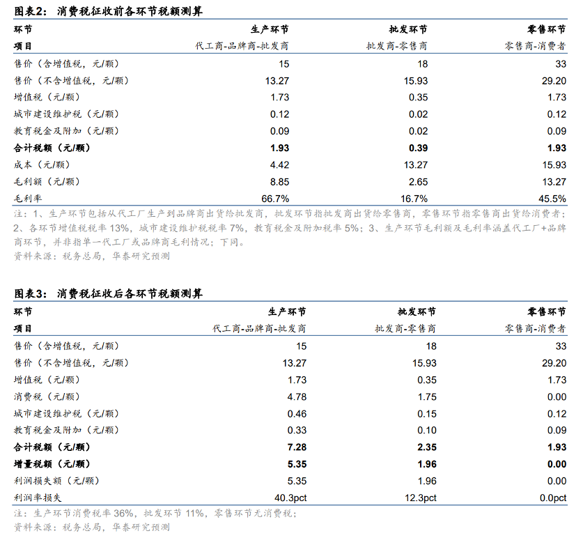 华泰研究以思摩尔国际代工的主流品牌烟弹为例进行了测算,假设生产环节出货价(品牌商出货给批发商)15元/颗,批发环节出货价(批发商出货给零售商)18元/颗,零售环节出货价33元/颗;再假设消费税征收后各环节均不涨价,消费税征收前,生产环节电子烟需缴纳的税款只有1.93元/颗,消费税征收后则达到7.28元/颗。也就是说,生产环节将多收5.35元/颗的税,盈利受损较大,导致利润率损失约40.3%。
