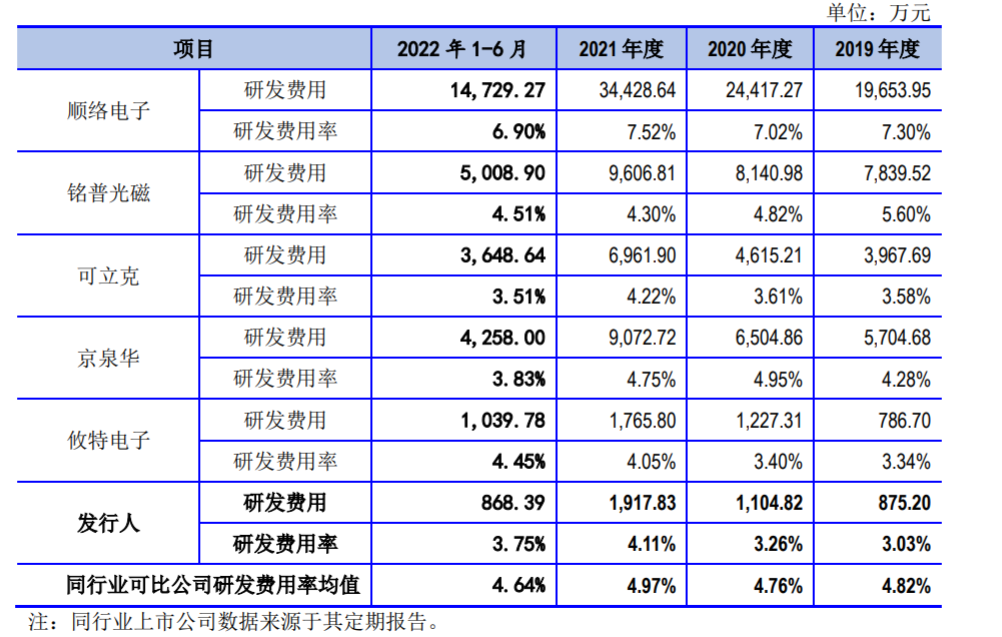 各报告期,公司研发费用率为3.03%、3.26%、4.11%和3.75%。同一时期行业可比公司研发费用率平均值为4.82%、4.76%、4.97%和4.64%。