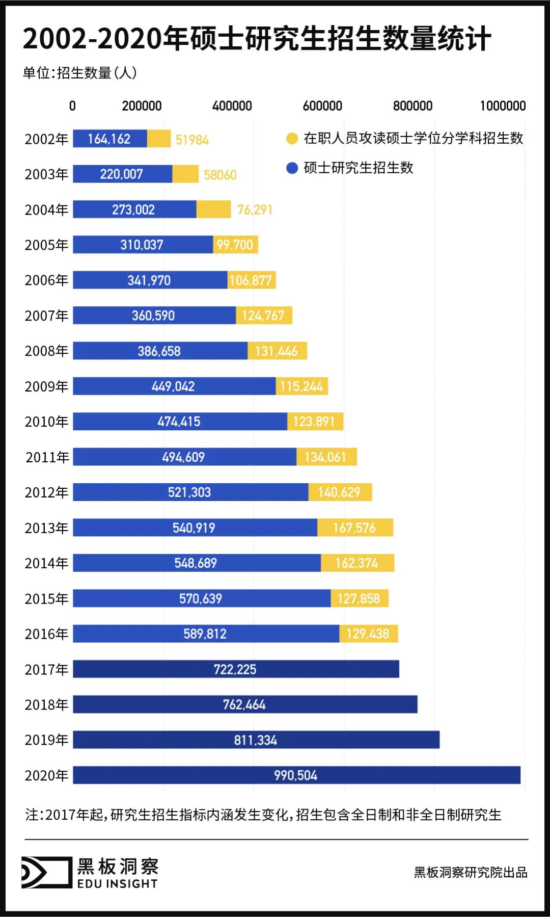 从上世纪末开始,研究生招生数量逐步增多,2017 年研究生扩招了 13.8 万,2020 年硕士研究生扩招 18.9 万。无论是全日制研究生还是非全日制研究生,其招生人数均呈上升趋势。2016 年,教育部发布《关于统筹全日制和非全日制研究生管理工作的通知》,明确表示二者学历学位证书具有同等法律地位和相同效力。如卫蓉一样的在职人员考取非全日制研究生的意愿更加强烈。