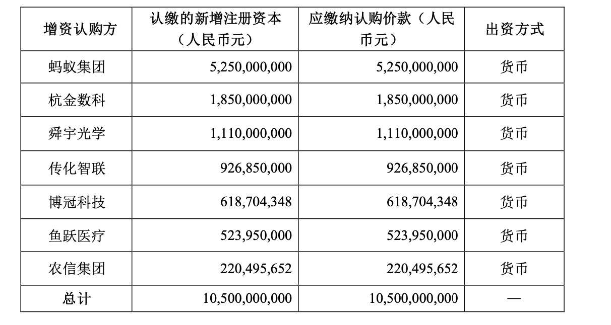 11月14日晚间,多家上市公司披露的公告显示,时隔一年,重庆蚂蚁消费金融公司(下称“蚂蚁消金”)增资方案修改后确定,包括蚂蚁集团、杭州金投数字科技集团有限公司、舜宇光学、传化智联、鱼跃医疗、广州博冠科技信息科技有限公司、重庆农信投资在内的多家公司将参与本轮增资的股权认购。