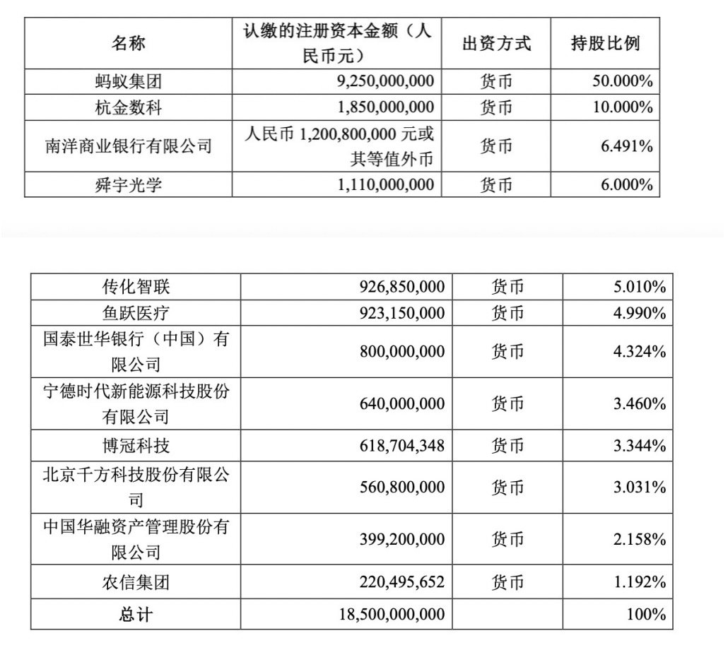 增资完成后,蚂蚁消金前五大股东分别为蚂蚁集团、杭州金投数字科技、南洋银行、舜宇光学和传化智联,持股比例分比为50%、10%、6.49%、6%和5.01%;另外还有7位股东,分别为鱼跃医疗、国泰世华银行(中国)、宁德时代、博冠科技、千方科技、中国华融和重庆农信投资。