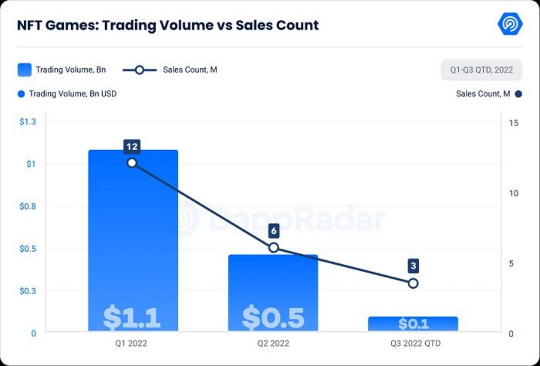 DappRader数据显示,今年一季度,游戏 NFT 总交易额超过10亿美元,二季度下跌了53%,三季度进一步暴跌到7100万美元,跌幅高达 84%。