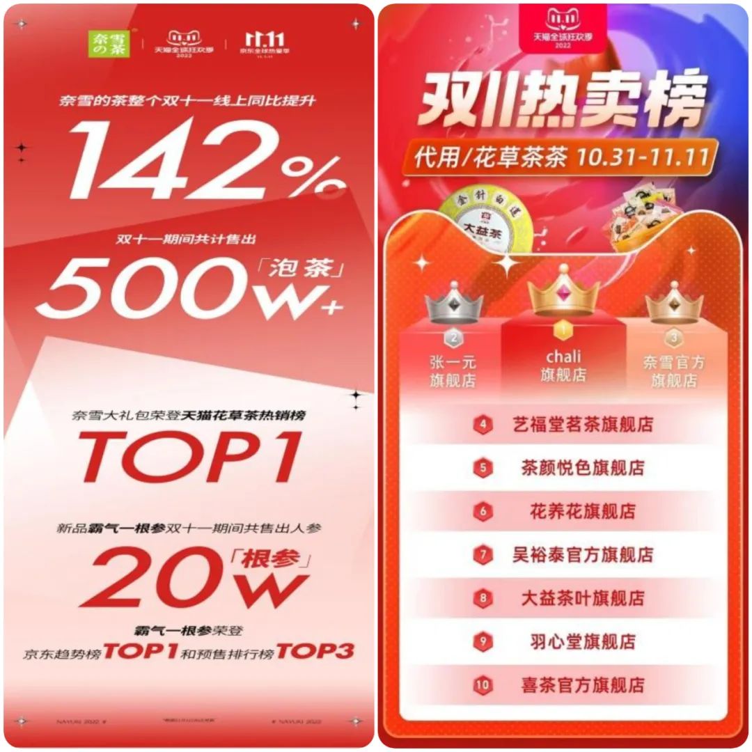 相对于现制产品,预制产品更适应于无限场景。在日前的双11数据中,奈雪电商销量同比增长142%,售出超过500万份袋泡茶。其中奈雪“霸气大礼包”登上天猫花草茶热销榜第一;茶礼盒新品“霸气一根参”登上了京东花草趋势榜TOP1。
