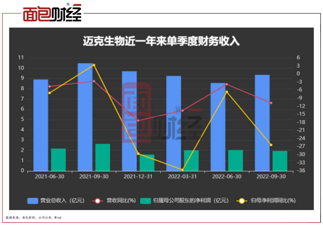 翻阅公司历史财务数据,自2021年第四季度开始,迈克生物单季度营收、归母净利润就在同比双双下滑。