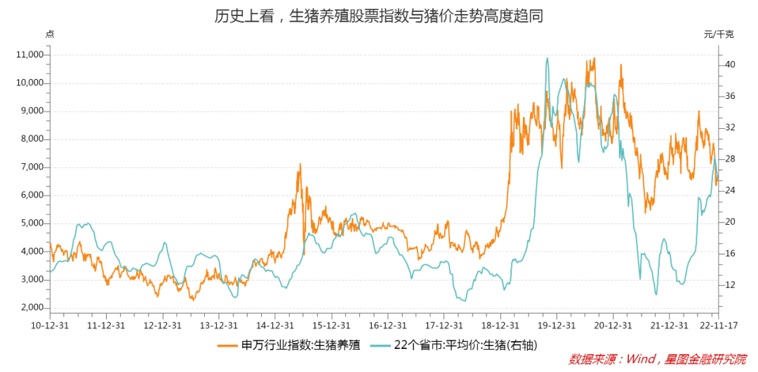 历史上看,生猪养殖板块行情与猪价走势高度趋同。2023年生猪价格处于高位,猪股在当前位置向下调整空间也必然极为有限。同时,考虑到2023年4月之前生猪供给的持续下降,以及春节前猪肉消费旺季的来临,猪肉价格仍有较大概率止跌回升,驱动股价再次反弹。