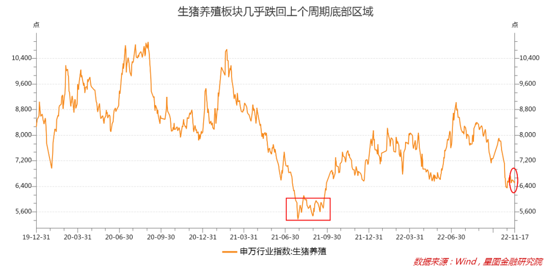 4季度本是猪肉消费旺季,在生猪供给紧平衡的状态下,投资者大多对年末行情充满期待,猪股的表现却不如人意。当前板块指数距离上个周期最低点仅有20%的空间,几乎跌回上个周期底部区域(2021年8-9月)。