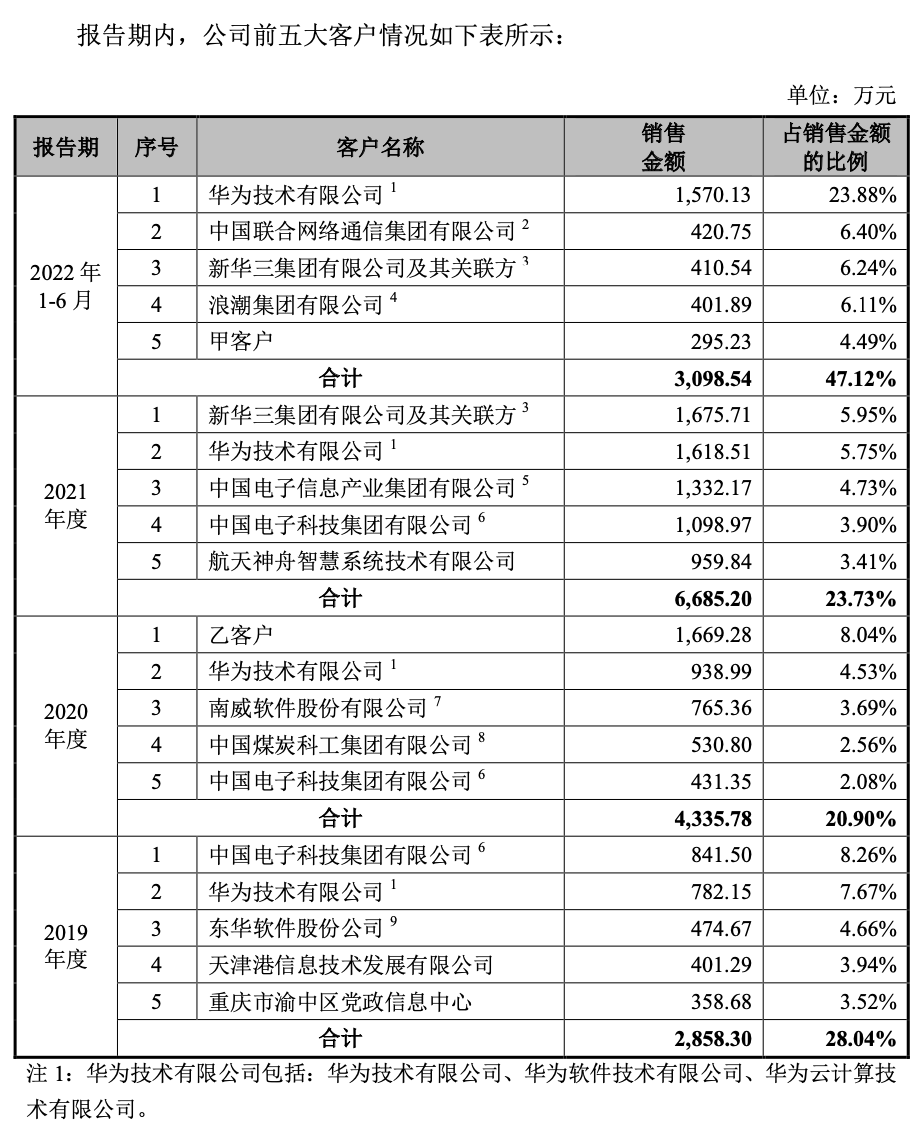 从下游客户来看,报告期内公司软件产品及服务收入来自政府领域的最终用户占比较高,占主营业务收入比例分别为63.79%、57.33%、64.71%和64.73%。而在前五大客户中,华为技术有限公司较为稳定。