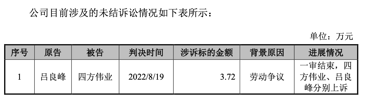 2022年8月19日,成都高新技术产业开发区人民法院作出(2021)川 0191 民初 17907 号《民事判决书》,就原告吕良峰与被告四方伟业之间劳动争议一案作出判决,被告四方伟业向原告吕良峰支付工资差额、未休年假工资合计3.72万元,驳回原告吕良峰的其他诉讼请求。四方伟业、吕良峰分别就该一审判决已提请上诉。
