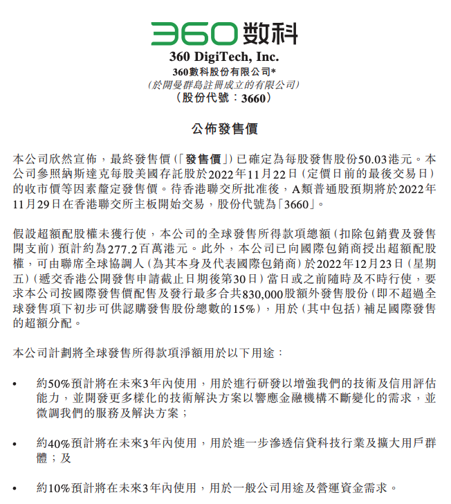 360数科11月23日晚间在港交所公告,最终发售价已确定为每股发售股份50.03港元。待香港联交所批准后,A类普通股预期将于2022年11月29日在香港联交所主板开始交易,股份代号为“3660”。假设超额配股权未获行使,公司的全球发售所得款项总额(扣除包销费及发售开支前)预计约为2.772亿港元。