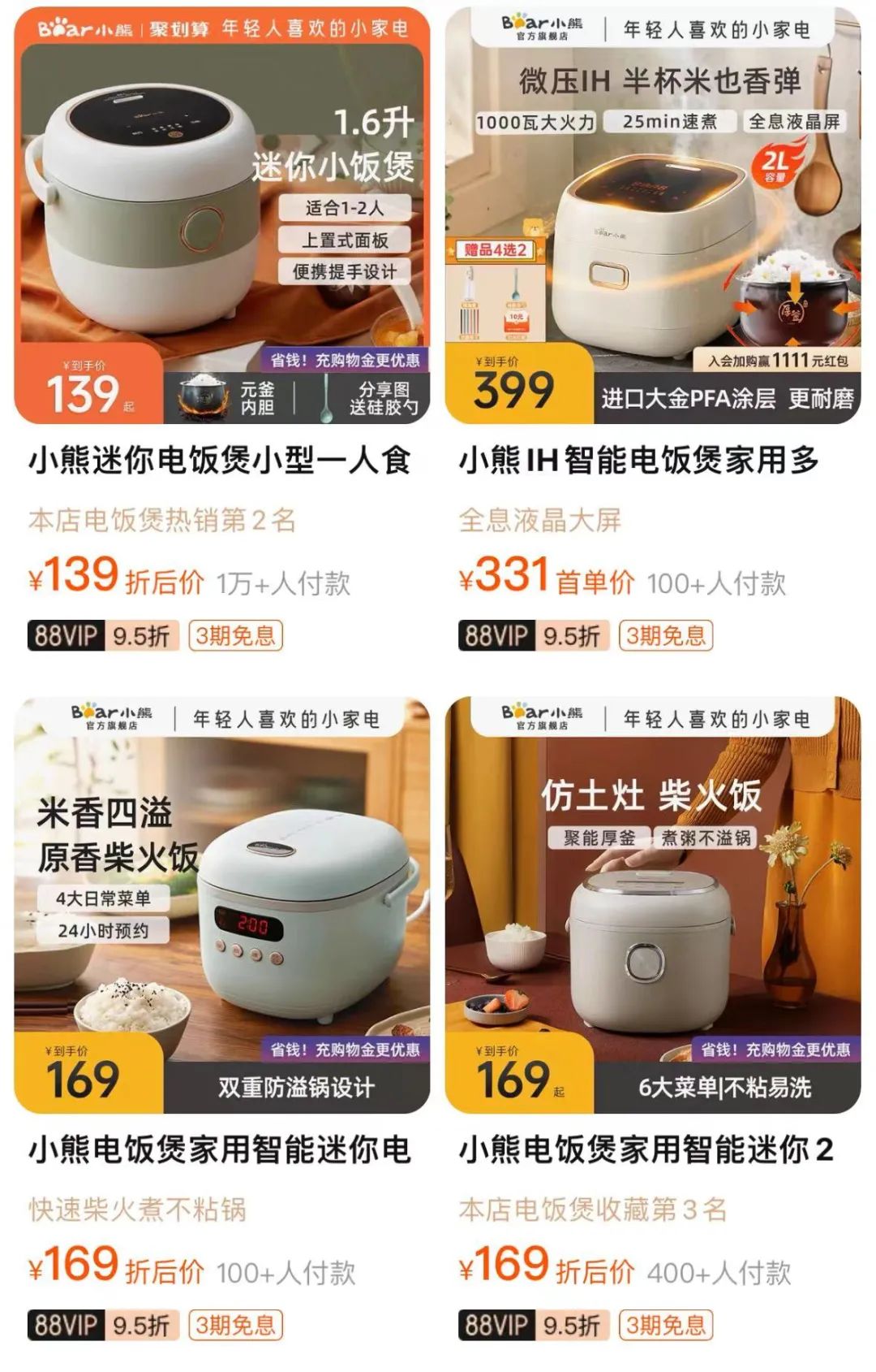 对比多家小家电企业的产品与价格后,今年双11,在李佳琦直播间的叫卖声中,今年26岁的刘星观望许久后,最终决定用149元下单了小熊一人食迷你电饭煲。