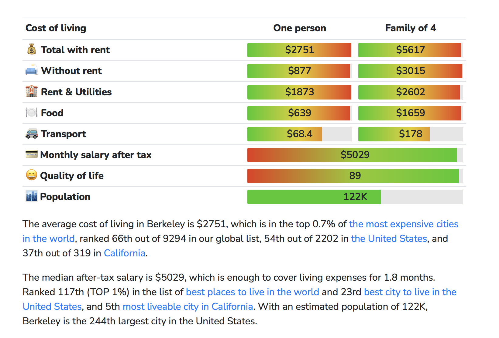 界面教育在LivingCost网站对加州大学几所分校所在地区的房租进行搜索,例如伯克利,人均每月的平均生活成本约2751美元,其中房租约1874美元,在全球最昂贵的城市中位列前0.7%。圣巴巴拉分校所在地区的生活成本则更高,人均每月平均生活成本高达约3455美元,房租约2415美元,位列全球最昂贵城市前0.1%。