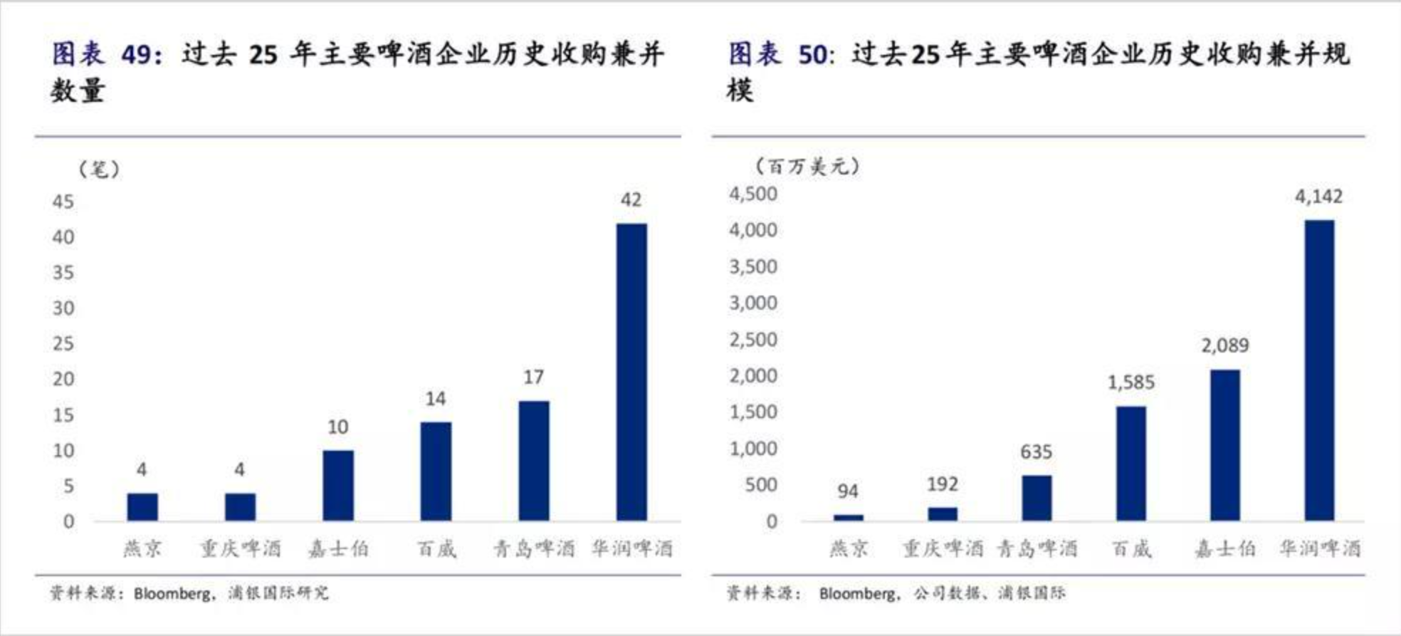 比较过去25年中啤酒行业的收并购,华润以42家并购数量傲视群雄,雄厚的资本实力助其迅速崛起。而燕京仅4次并购在“五雄”中垫底。