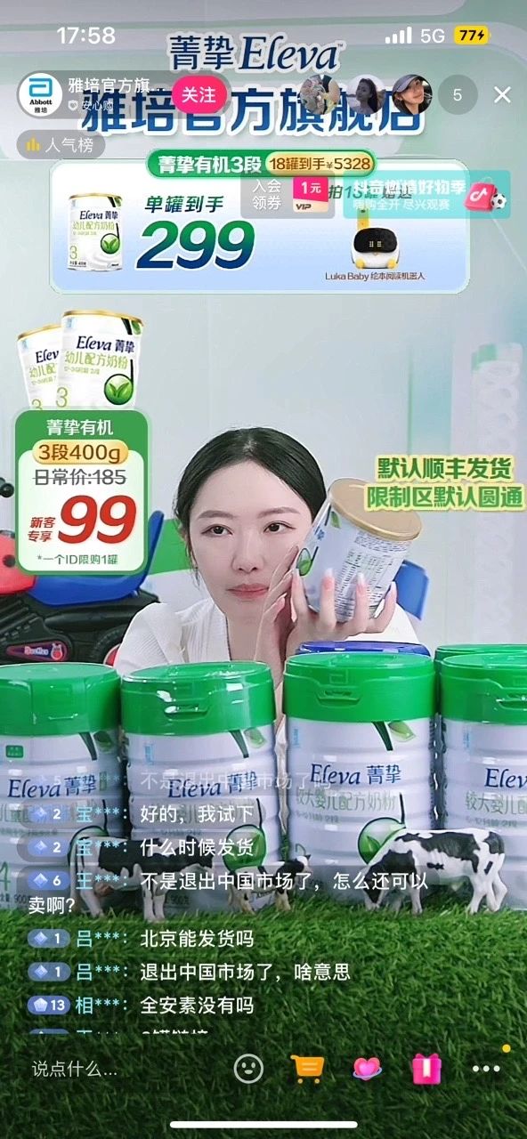 另一方面,在雅培的直播间,主播仍在带货菁挚、亲护、恩美力等系列。而对于评论区中“不是要退出中国市场了吗”等类似说法,该主播给予了肯定答复。