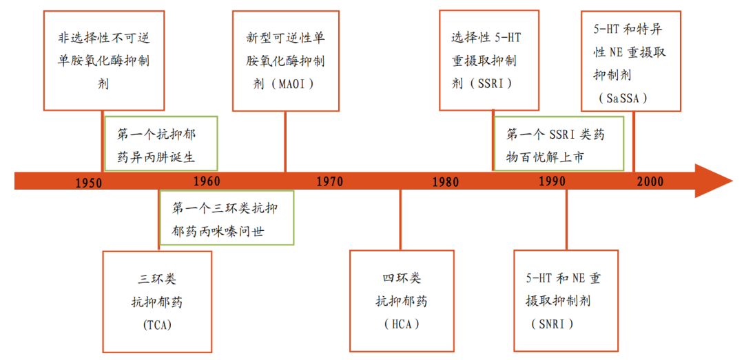遵循“单胺假说”,人类开始逐渐尝试通过阻断特定单胺重摄取进入神经末梢,以此达到提高单胺水平的目的,三环类(TCA)、四环类(HCA)以及选择性5-HT重摄取抑制剂(SSRI)等药物就是如此被设计出来的。